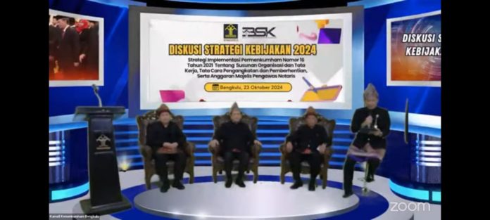 RAKYAT DAERAH – Kantor Wilayah (Kanwil) Kementerian Hukum dan HAM (Kemenkumham) Bengkulu sukses menggelar Diskusi Strategis Kebijakan Tahun 2024 pada 23 Oktober 2024. Diskusi ini mengangkat tema “Strategi Implementasi Permenkumham Nomor 16 Tahun 2021 tentang Susunan Organisasi, Tata Kerja, Tata Cara Pengangkatan dan Pemberhentian serta Anggaran Majelis Pengawas Notaris”.