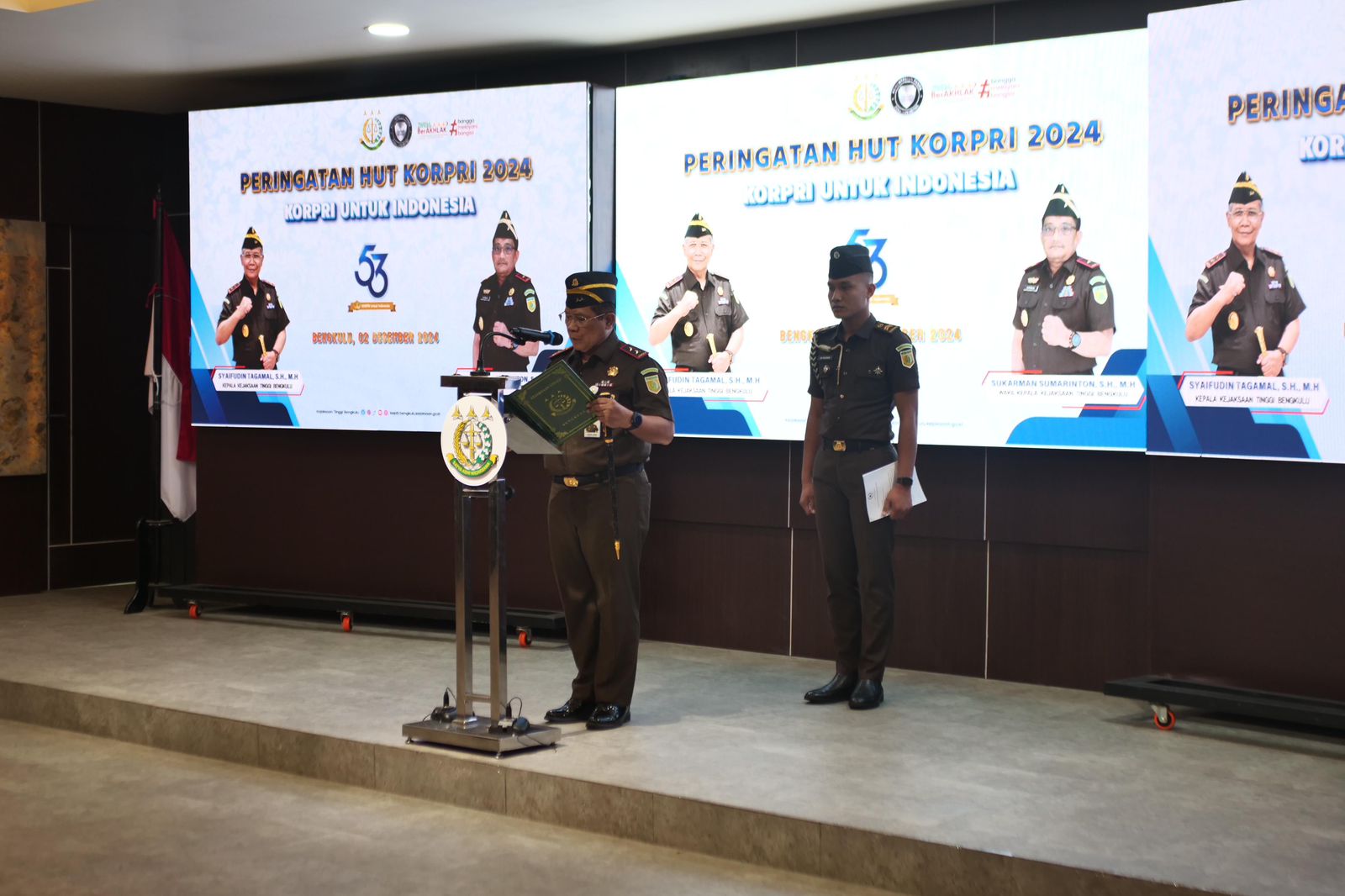 RAKYAT DAERAH – Kejaksaan Tinggi (Kejati) Bengkulu menggelar upacara peringatan Hari Ulang Tahun (HUT) Korps Pegawai Republik Indonesia (Korpri) ke-53. Upacara yang digelar Senin (2/12) dipimpin langsung Kepala Kejati Bengkulu, Syaifudin Tagamal, SH, MH, di Aula Sasana Bina Karya, Kantor Kejaksaan Tinggi Bengkulu.