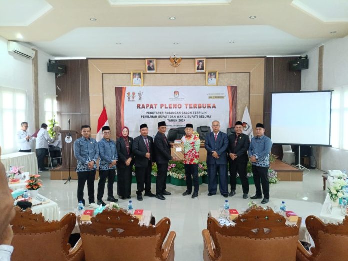 RAKYAT DAERAH – Melalui rapat pleno terbuka, Komisi Pemilihan Umum Kabupaten Seluma resmi menetapkan calon Bupati dan Wakil Bupati Seluma terpilih, yaitu pasangan Teddy Rahman-Gustianto, di Aula Badan Keuangan Daerah Seluma, Kamis (9/1).