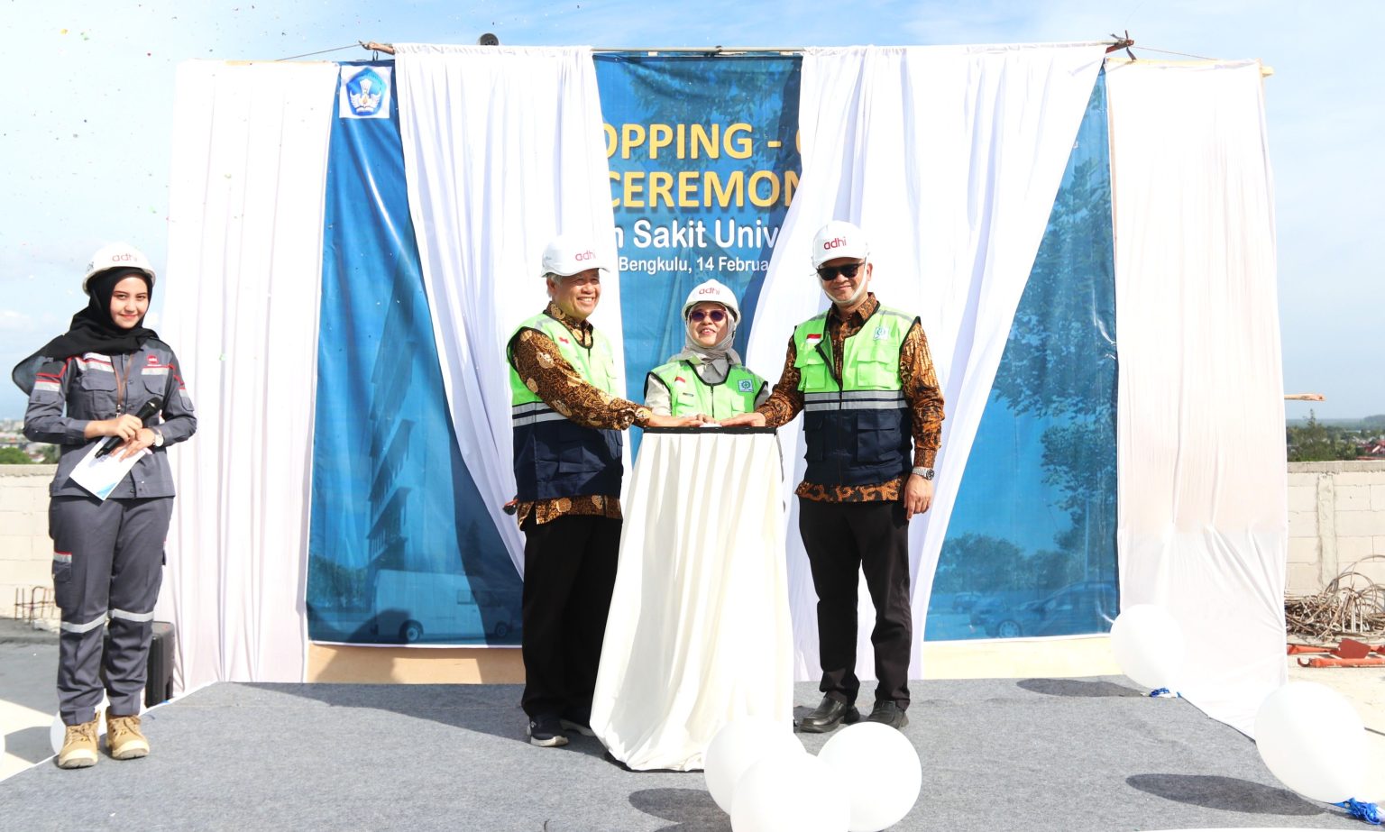 Seremoni ini menandai tahap akhir pembangunan struktur gedung yang dilakukan di lantai tujuh, ditandai dengan pengecoran simbolis serta penekanan tombol sirine yang diiringi pembukaan backdrop bertuliskan “Topping-Off Ceremony Proyek Rumah Sakit Pendidikan Universitas Bengkulu”.