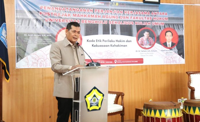 Dalam kesempatan tersebut, Dr. Andi Akram turut menyampaikan materi dalam kuliah umum bertema “Kode Etik dan Perilaku Hakim.” Kegiatan ini mendapat antusiasme tinggi dari mahasiswa FH Unib, yang turut berpartisipasi aktif dalam sesi diskusi.