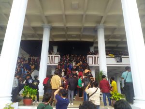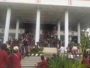 Teks Foto : Aksi Mahasiswa berhasil menduduki pelataran gedung DPRD provinsi Bengkulu.