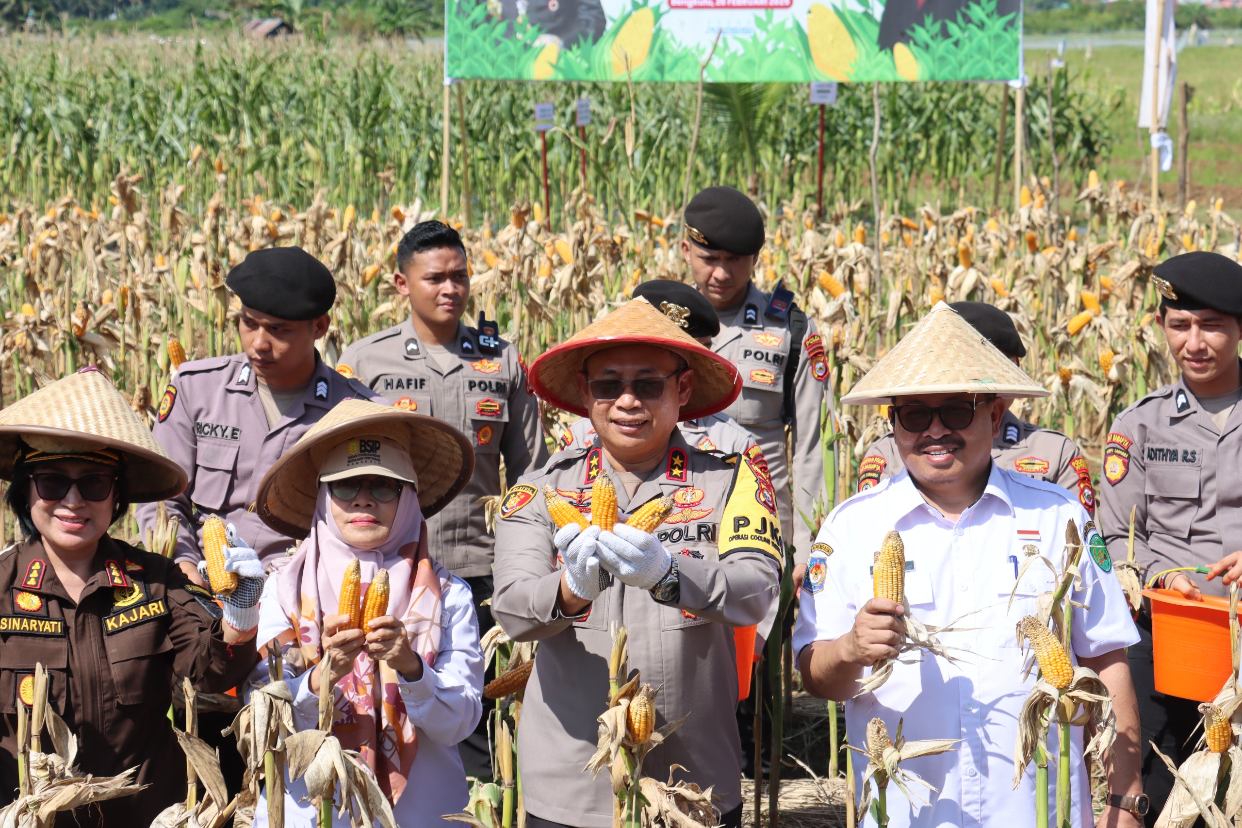 RAKYAT DAERAH – Mendukung program Presiden RI Prabowo Subianto swasembada pangan, Polda Bengkulu Rabu pagi (26/2) menggelar panen raya Jagung yang berlokasi di di Jalan Irian RT 4 Kelurahan Tanjung Jaya Kecamatan Sungai Serut Kota Bengkulu.