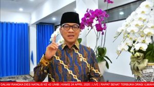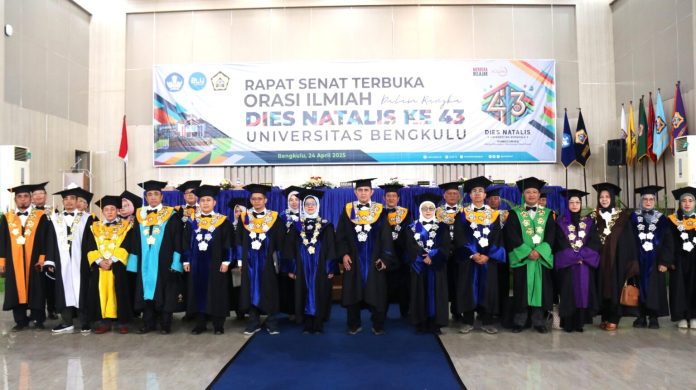 RAKYAT DAERAH – Universitas Bengkulu (Unib) yang berdiri pada 24 April 1982, memperingati hari jadinya ke-43 tahun dengan menggelar Rapat Paripurna Terbuka Senat Universitas, Kamis pagi (24/4/2025), di Gedung Serba Guna (GSG) Unib. Acara puncak Dies Natalis ini diwarnai dengan orasi ilmiah oleh dua alumni unggulan yang kini telah menjadi tokoh nasional dan akademisi terkemuka di bidangnya.