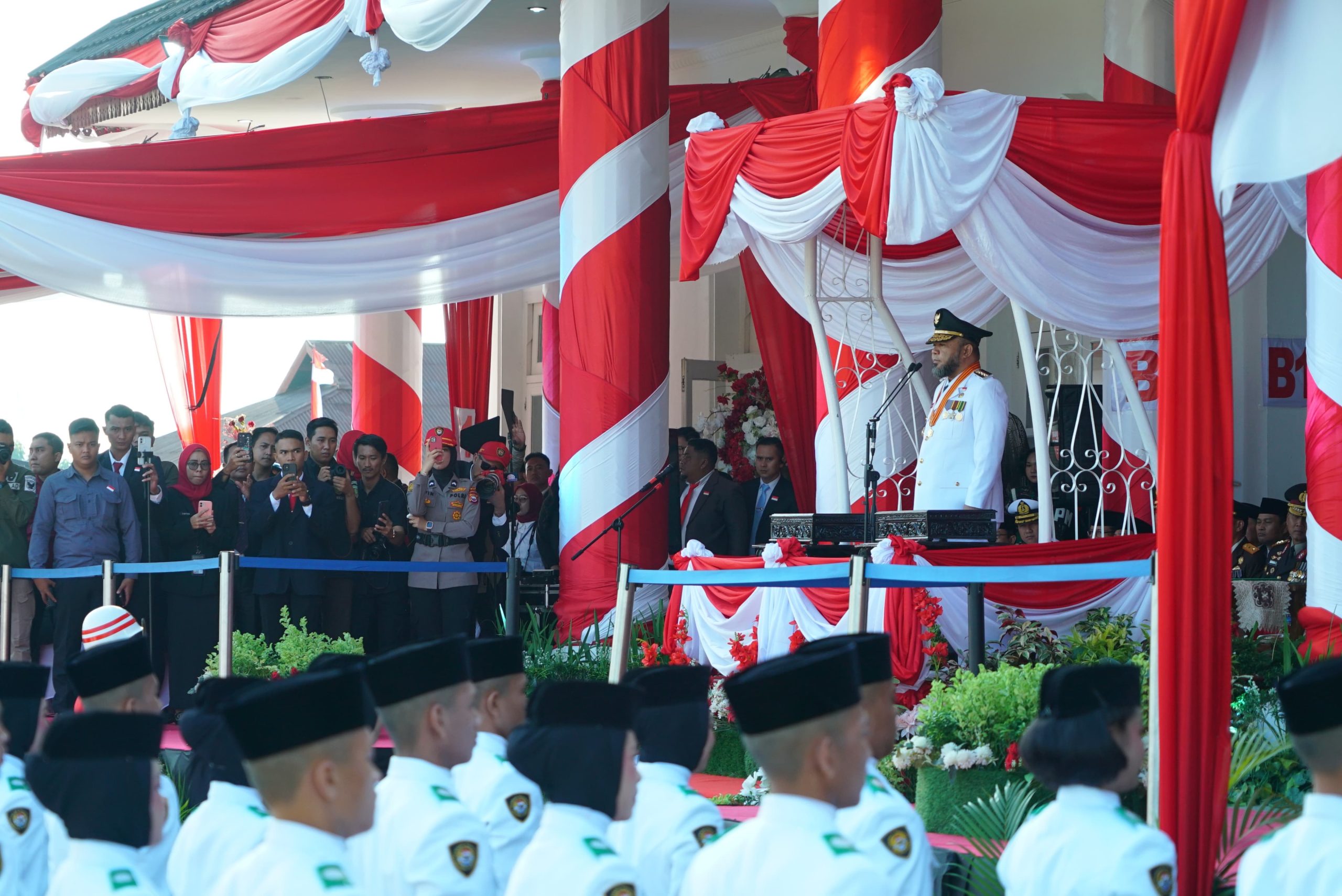 RAKYAT DAERAH – Upacara Pengibaran Bendera Merah Putih pada puncak peringatan Hari Ulang Tahun (HUT) ke-80 Republik Indonesia yang digelar di Lapangan Balai Raya Semarak, berlangsung khidmat pada Minggu (17/8) pagi.