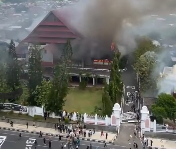 Pembakaran kantor DPRD NTB sontak menjadi tontonan warga. Di tengah kepulan asap, seruan “revolusi” bergema dari arah massa yang berkumpul di depan kantor.