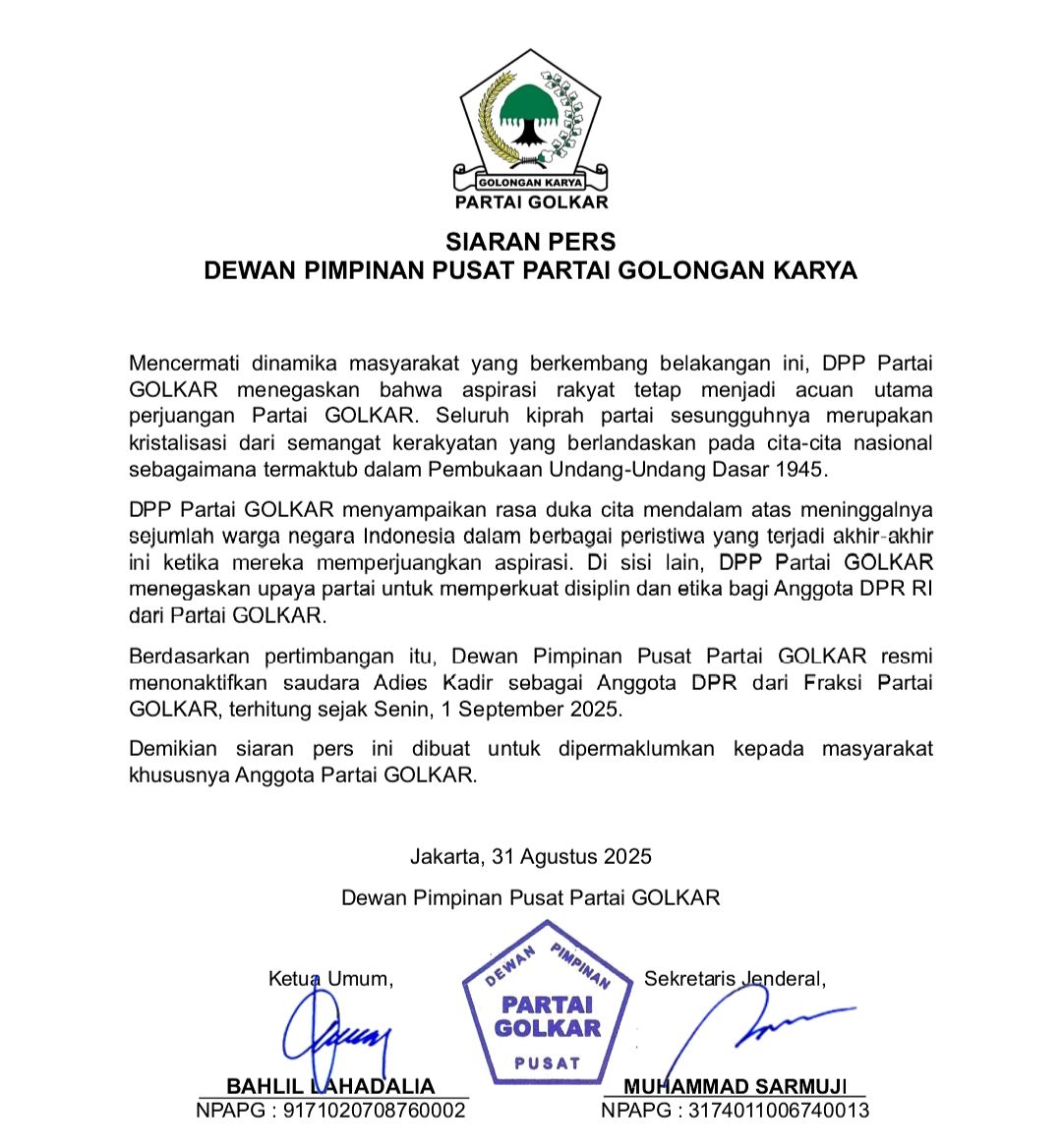 “Berdasarkan pertimbangan itu, DPP Partai Golkar resmi menonaktifkan saudara Adies Kadir sebagai Anggota DPR dari Fraksi Partai Golkar terhitung sejak Senin, 1 September 2025,” ucap Surmaji, Minggu (31/8).