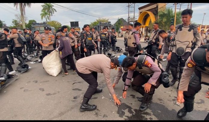 “Itu sebenarnya etika, supaya kita selesai melakukan kegiatan. Paling tidak, buat lingkungan kamu itu lebih bersih dari sebelum kamu menggunakan. Kalau bisa lebih baik lagi,” ujar Kapolda kepada awak media usai massa membubarkan diri, Selasa (2/9).
