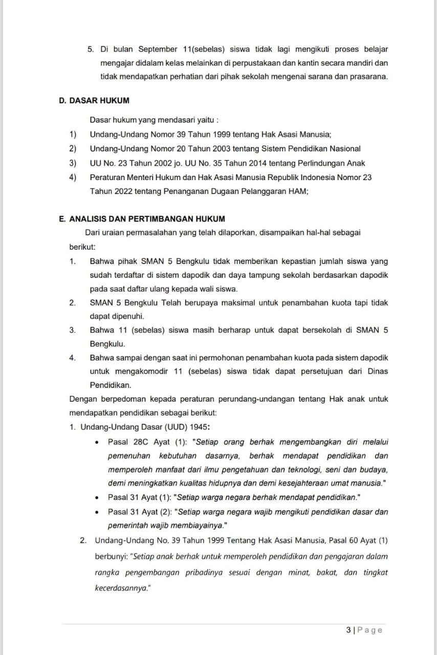 RAKYAT DAERAH – Kementerian Hak Asasi Manusia (Kemenham) melalui Kantor Wilayah Sumatera Selatan wilayah kerja Bengkulu mengeluarkan rekomendasi resmi terkait dugaan pelanggaran HAM dalam kasus 11 siswa SMAN 5 Bengkulu yang tidak terdaftar di Data Pokok Pendidikan (Dapodik).