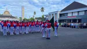Kegiatan apel pagi ditutup dengan prosesi pelepasan kontingen dan penyerahan kunci ambulans secara simbolis dari perwakilan PT IBI kepada Pj Sekda Bengkulu. [011]