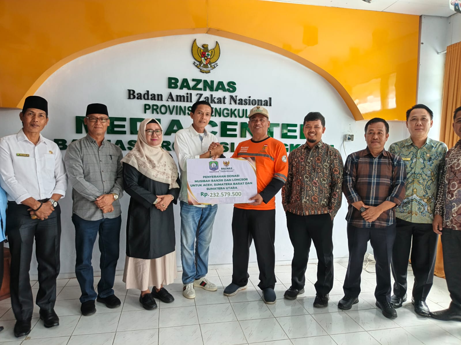 Bupati Kaur menerima bantuan masyarakat dari Baznas Kaur untuk disalurkan ke daerah bencana Sumatera.dok_humas