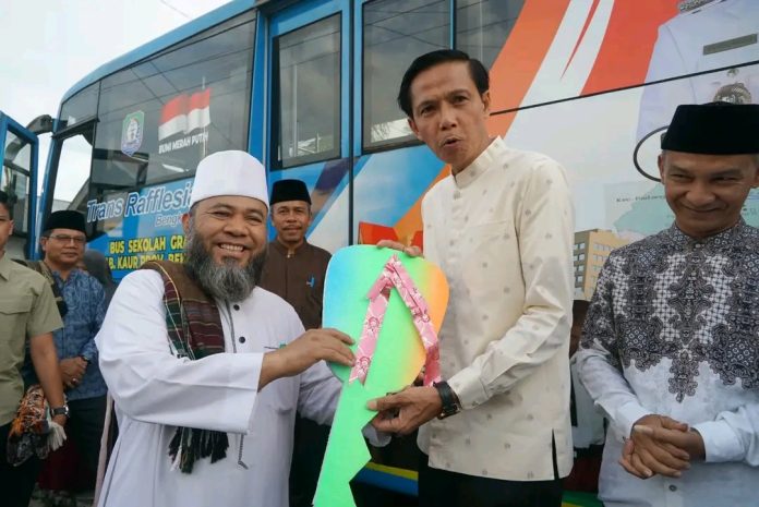 RAKYAT DAERAH – Gubernur Bengkulu, Helmi Hasan, menyerahkan bantuan satu unit bus sekolah gratis kepada Pemerintah Kabupaten Kaur. Bantuan tersebut diterima langsung oleh Bupati Kaur, Gusril Pausi, didampingi Wakil Bupati Abdullah Hamid.
