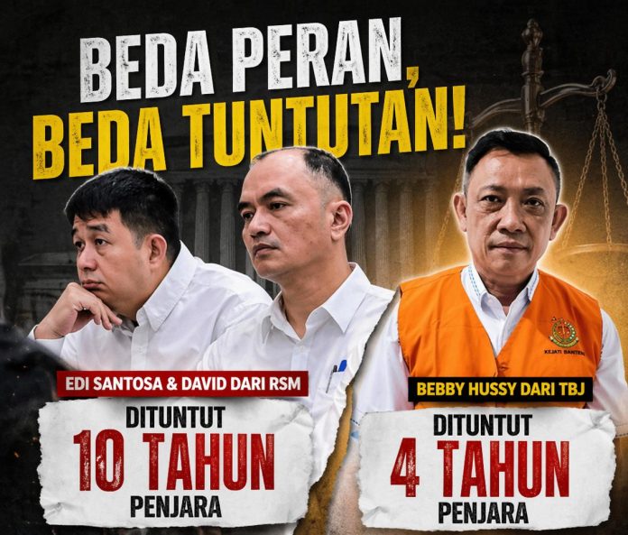 Jaksa Penuntut Umum menuntut Edi Santosa, Direktur PT RSM, dengan hukuman 10 tahun penjara, denda Rp2 miliar subsider 290 hari kurungan, serta membayar uang pengganti sebesar Rp53 miliar. Jika tidak dibayar, diganti pidana tambahan 4 tahun penjara.